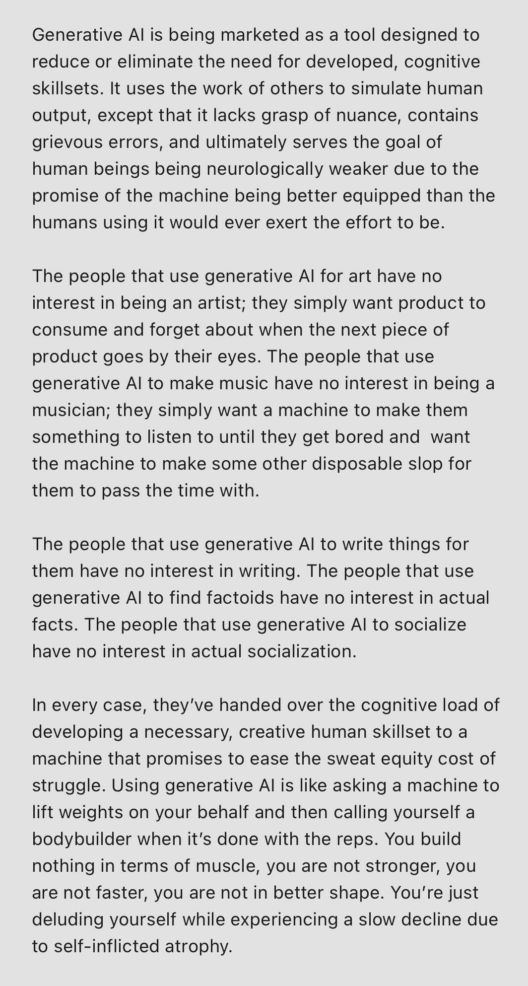 I DO NOT USE GenAI in any part of my life, my work, or my hobbies.I am a human with a creative soul and Generative AI is not only harmful to the environment, but to the human mind.GenAI makes you stupid. GenAI is not creative. GenAI makes you a loser.You can read a perfect breakdown of the creative mind's thoughts on generative AI here, by the brilliant Yeet Kune Do.